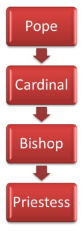 Priestesses and bishops are largely responsible for the day to day operations of church business and services. Higher ranking officials are more responsible for political matters and tending to the needs of Catholic States and also working with world leaders to further expand the influence of the church by converting and creating new Catholic States. Within the Holy See today, there are seven cardinals who are said to represent the women of Genesis. The church is led by the Pope who has had a number of titles bestowed upon her position- Holy Matriarch, Great Mother, Queen Regent of the Catholic States- just to name a few.